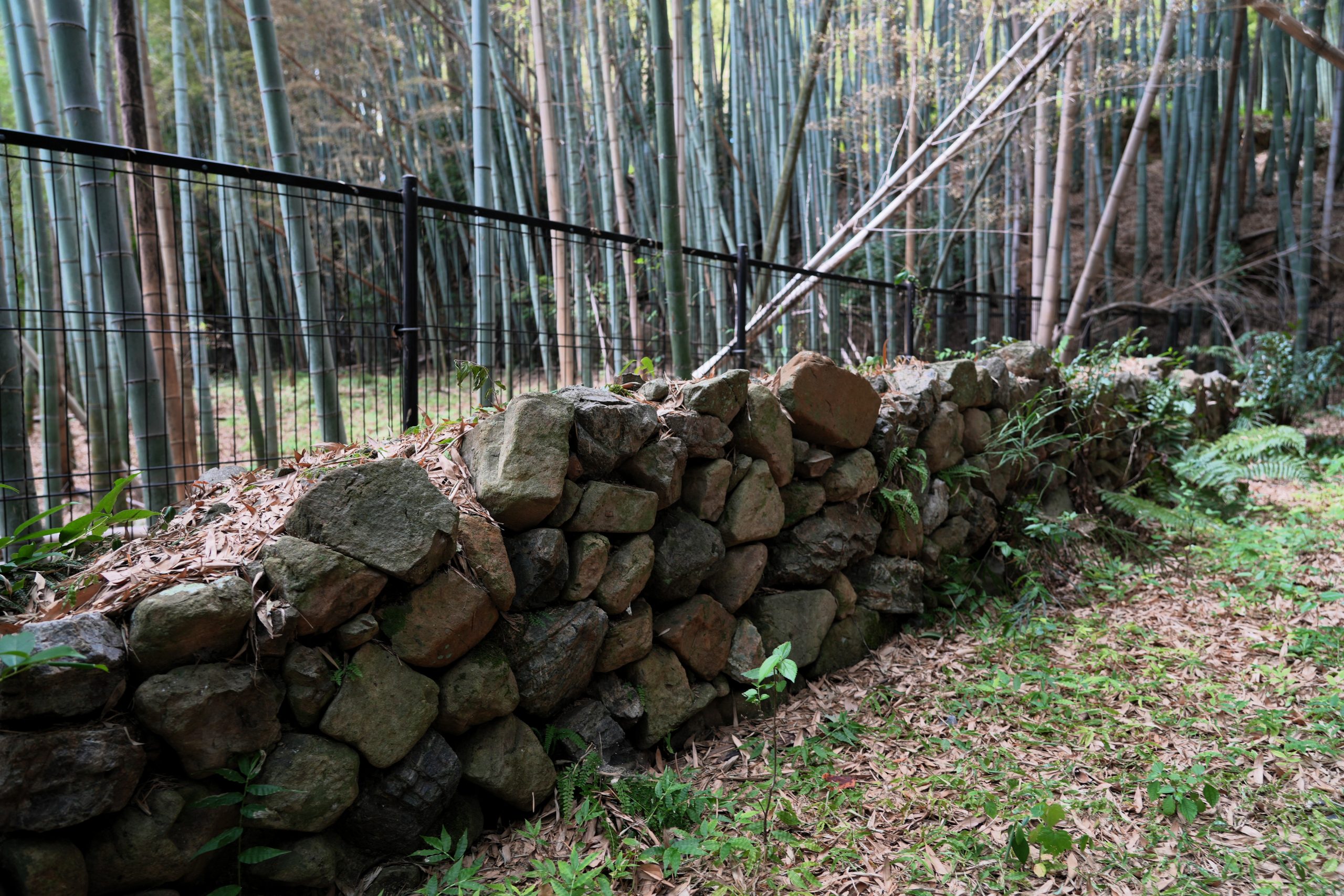発掘された勝持寺子院の遺構(室町時代) 勝持寺参道沿いには勝持寺子院を囲んでいたという石塁が移設されている