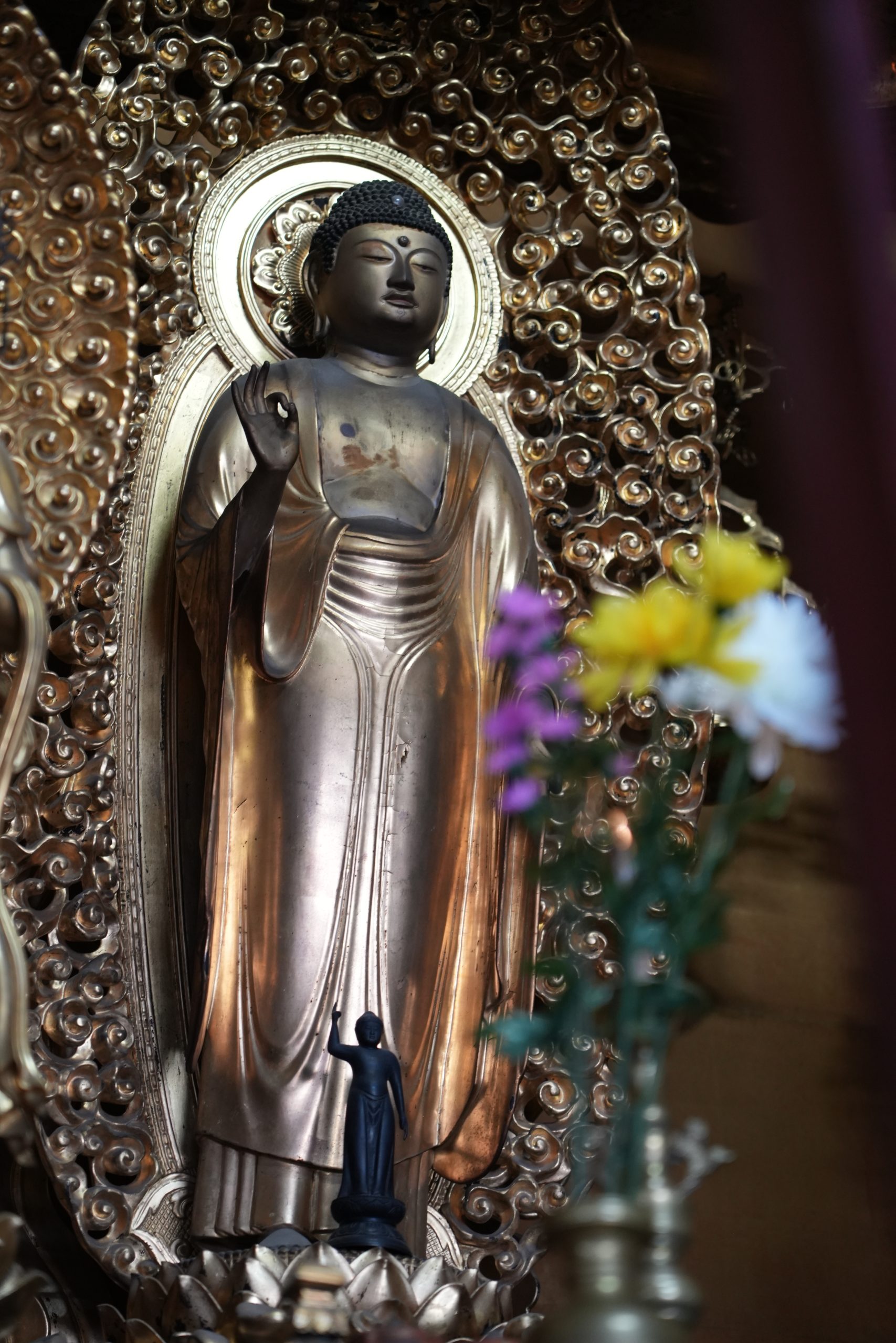 迫力ある本堂の姿に圧倒される中、中央に目を向けると金色に輝く優美な仏様がおまつりされていました。