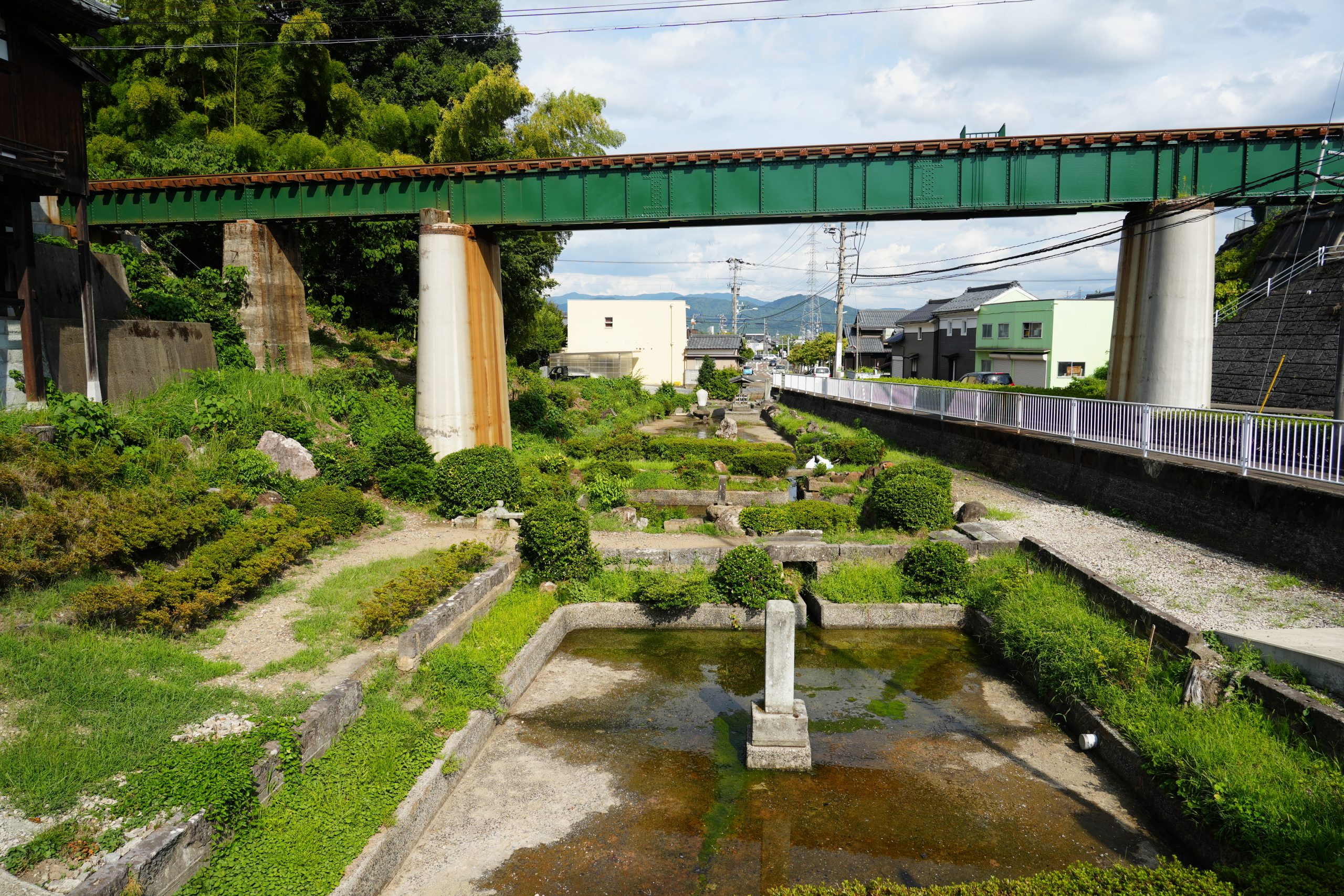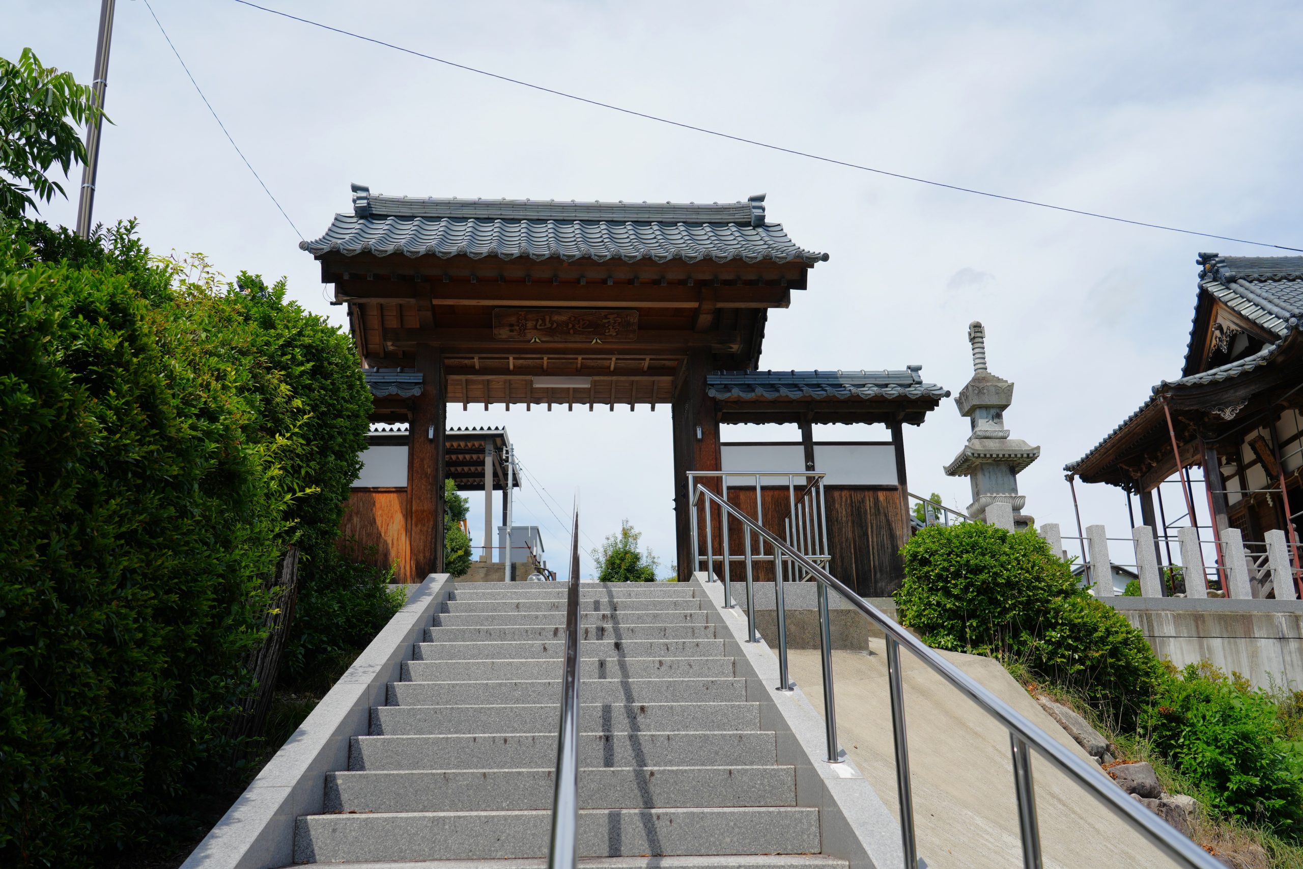 中道院の寺域は斜面の高みに広がり、多くの車が行き交う道路から石段を上って本堂のある高みへと至ります。見上げると、電車の軌道が本堂とほぼ同じ高さを横切り、まるで屋根の上を列車が空へ滑っていくかのように映りました。