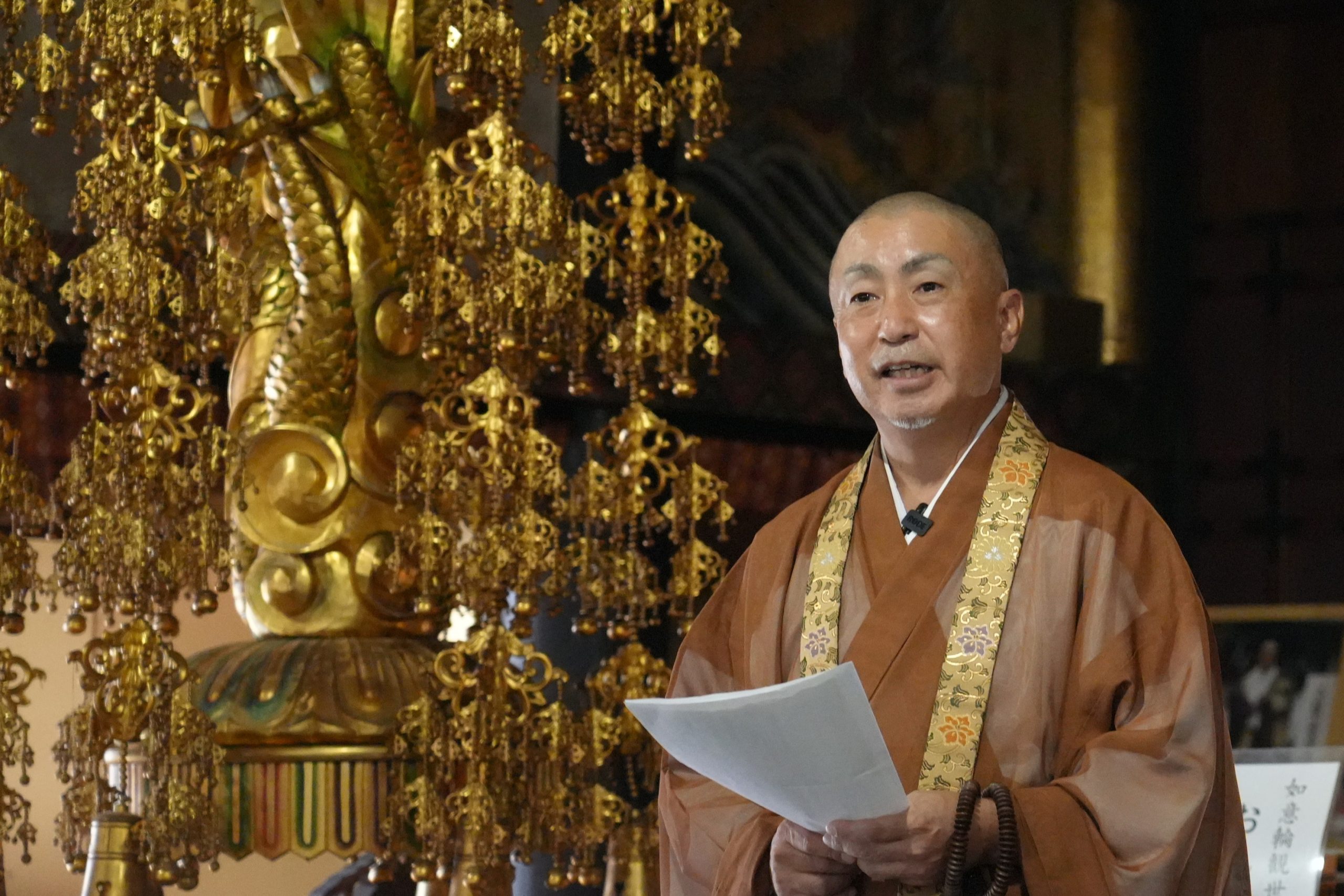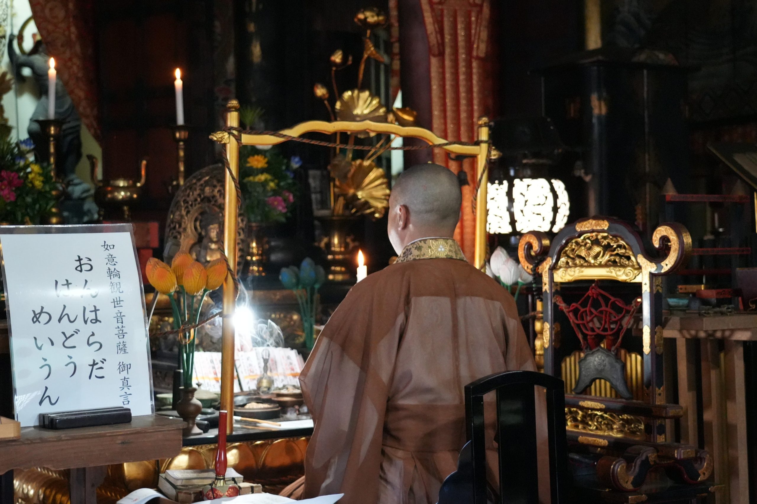 「皆さん中央に視点を移してください。中央にお祀りしている仏様が松尾寺の御本尊である如意輪観音様です。通常ですと、1年に1度、4月第一日曜日に執り行われる採灯大護摩供のときだけ御開扉する秘仏ですが、今回皆さんが松尾寺をお参りするということで特別に御開扉いたしました。」
