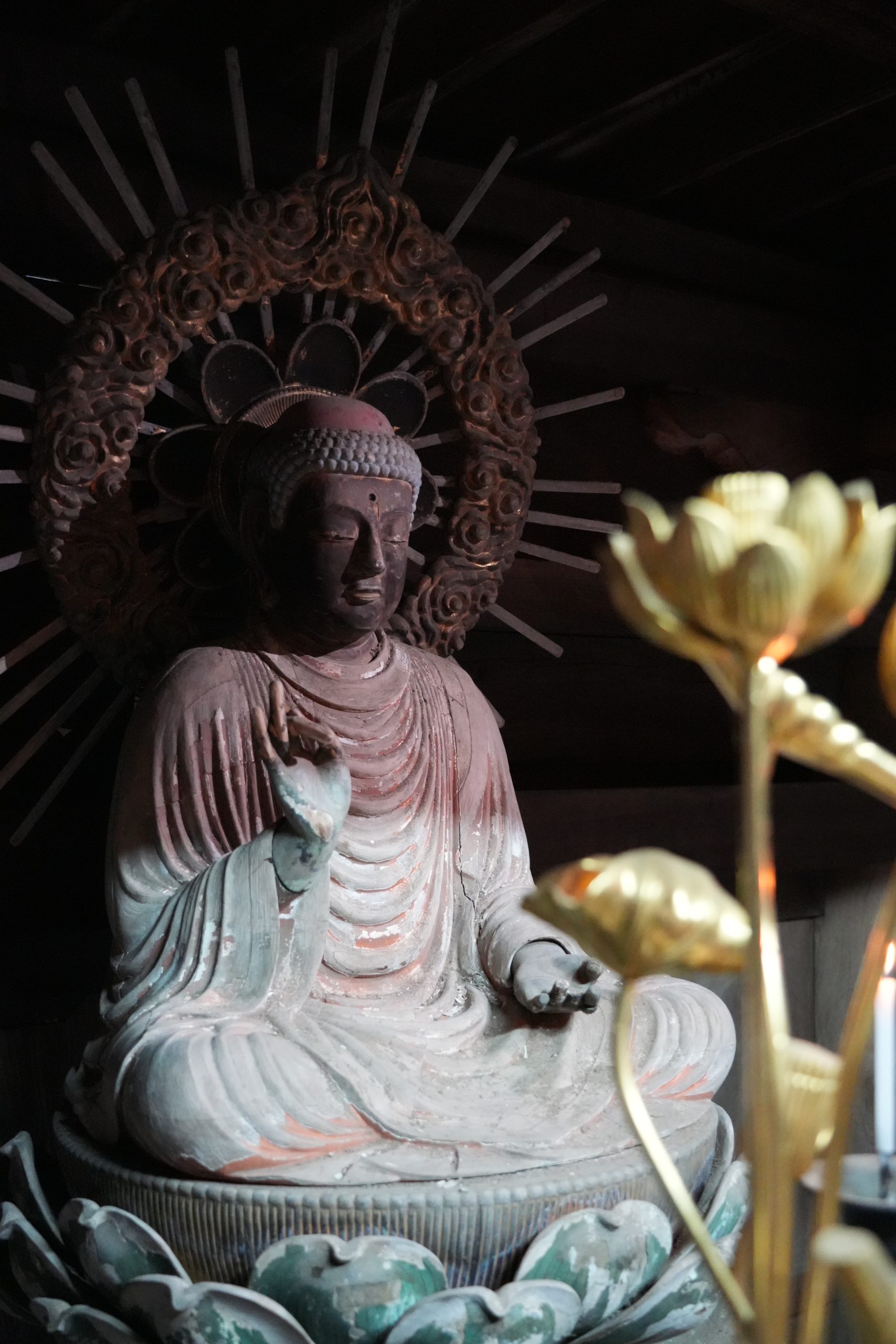 6本の腕が天道・人間道・修羅道・畜生道・餓鬼道・地獄道の六道を表しており、その六道に存在する人間や動物などのすべての命を救うことを深く考えているお姿が如意輪観音様のお姿であるとご住職に教えていただきました。今回、特別に御開帳していただいた御本尊様のお姿をお参りしていると、金色に輝くお姿や穏やかでどこか物憂げな眼差しが印象深く感じ、いつまでも御本尊様と対峙していたいと感じました。役行者が開創して以来、如意輪観音様の眼差しにうつる社会はどのようであったのか、大いに隆盛したという松尾寺の悠久の歴史を御本尊様の眼差しから強く感じました。