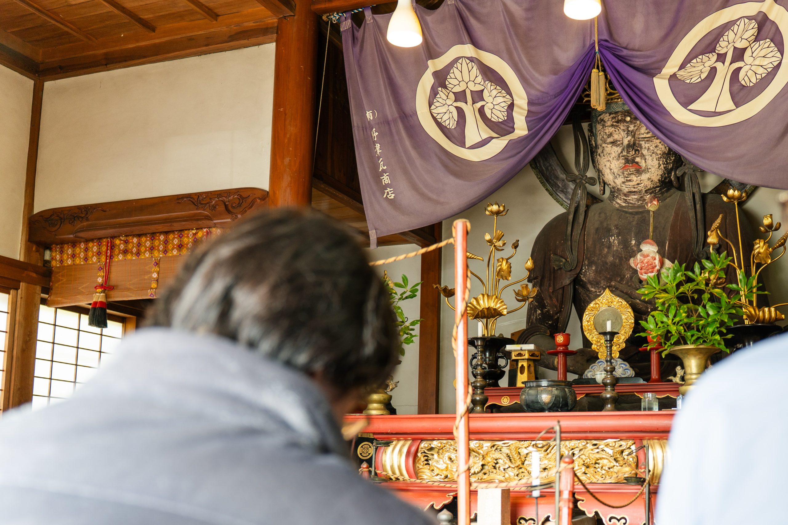 「先ほどの観音堂では五穀豊穣などの御祈願を主に行っています。こちらの回向堂では、檀家の皆様の回向を行っております。どうぞお入りください。」