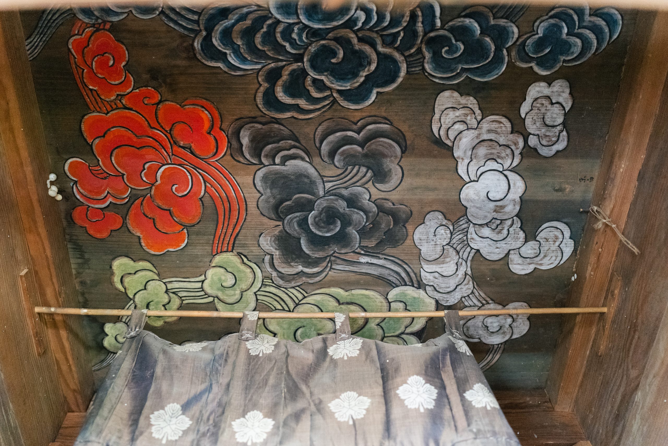 赤や白、青、黒、緑などで描かれた極彩色の雲の絵がダイナミックに描かれており、鮮やかな雲が実際に立ち込めているように感じました。
