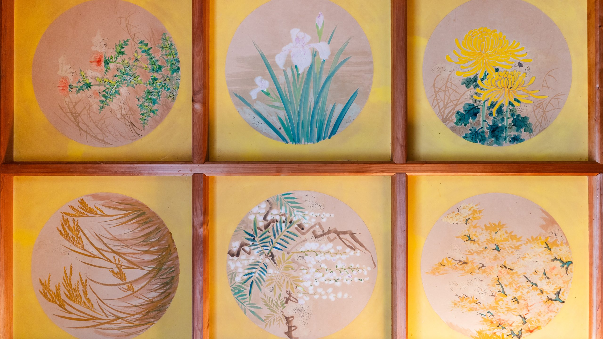 「こちらの天井画は、小林探水画伯によって描かれた草花を題材にした天井画で、昭和56年に奉納いただいたものです。以前は天井には何もなかったので、ある檀家さんから絵を張ってみたらどうかというお声をもとに天井画を御奉納いただきました。」