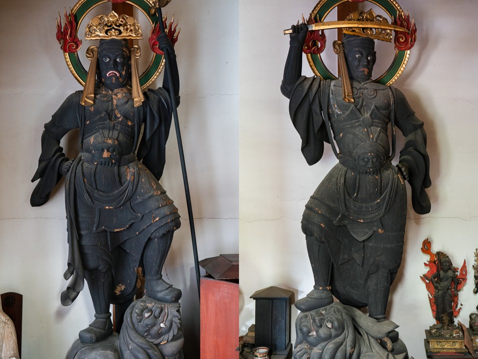刀や槍を持ち、ギョロっと大きく目を見開き睨みをきかせている二天王様。