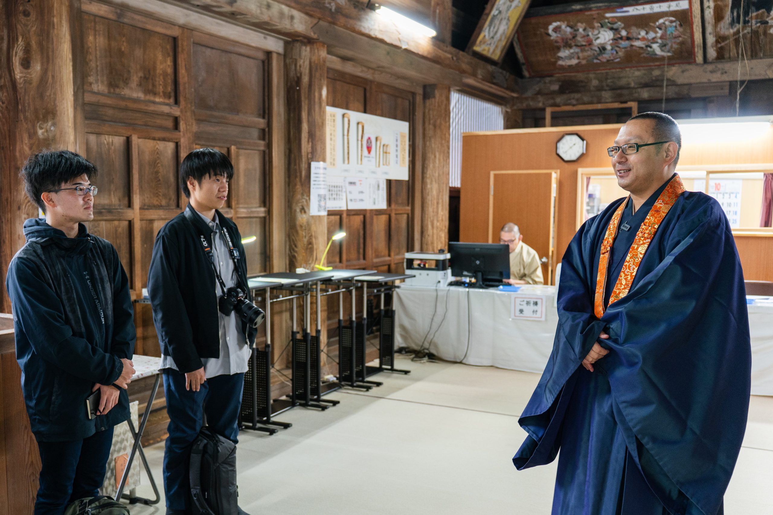 根本堂へ到着すると、清水谷師が学生たちを出迎えました。