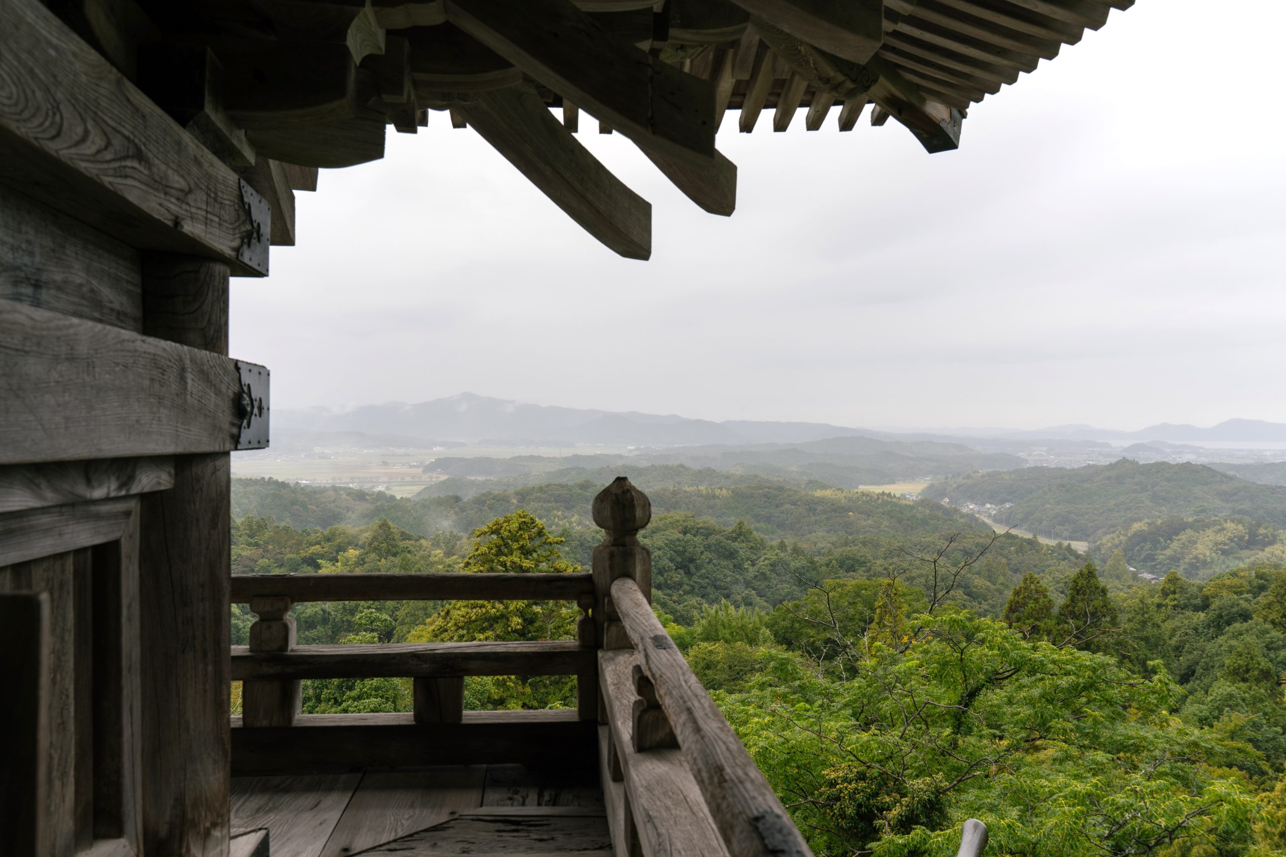 恐る恐る軒下に出てみると、眼下には能義平野、遠くには日本海を眺望することができました。