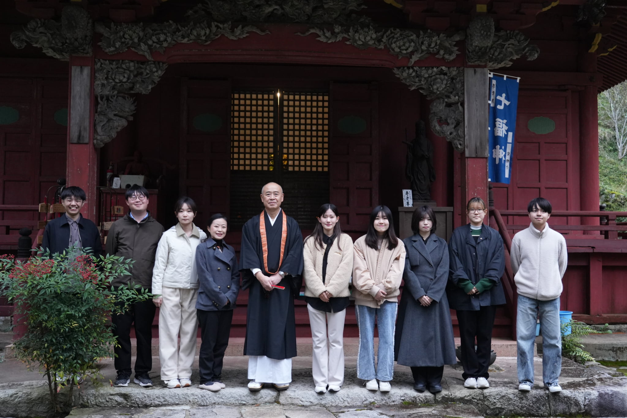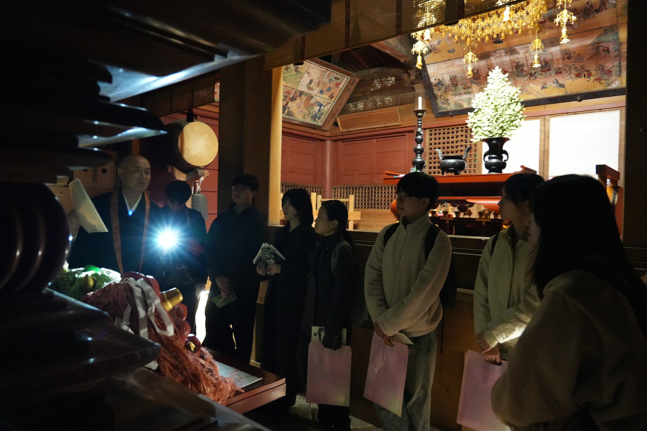 今回の訪問の最後、学生たちは先人たちの想いがこもる石段を下り、客殿を訪れました。