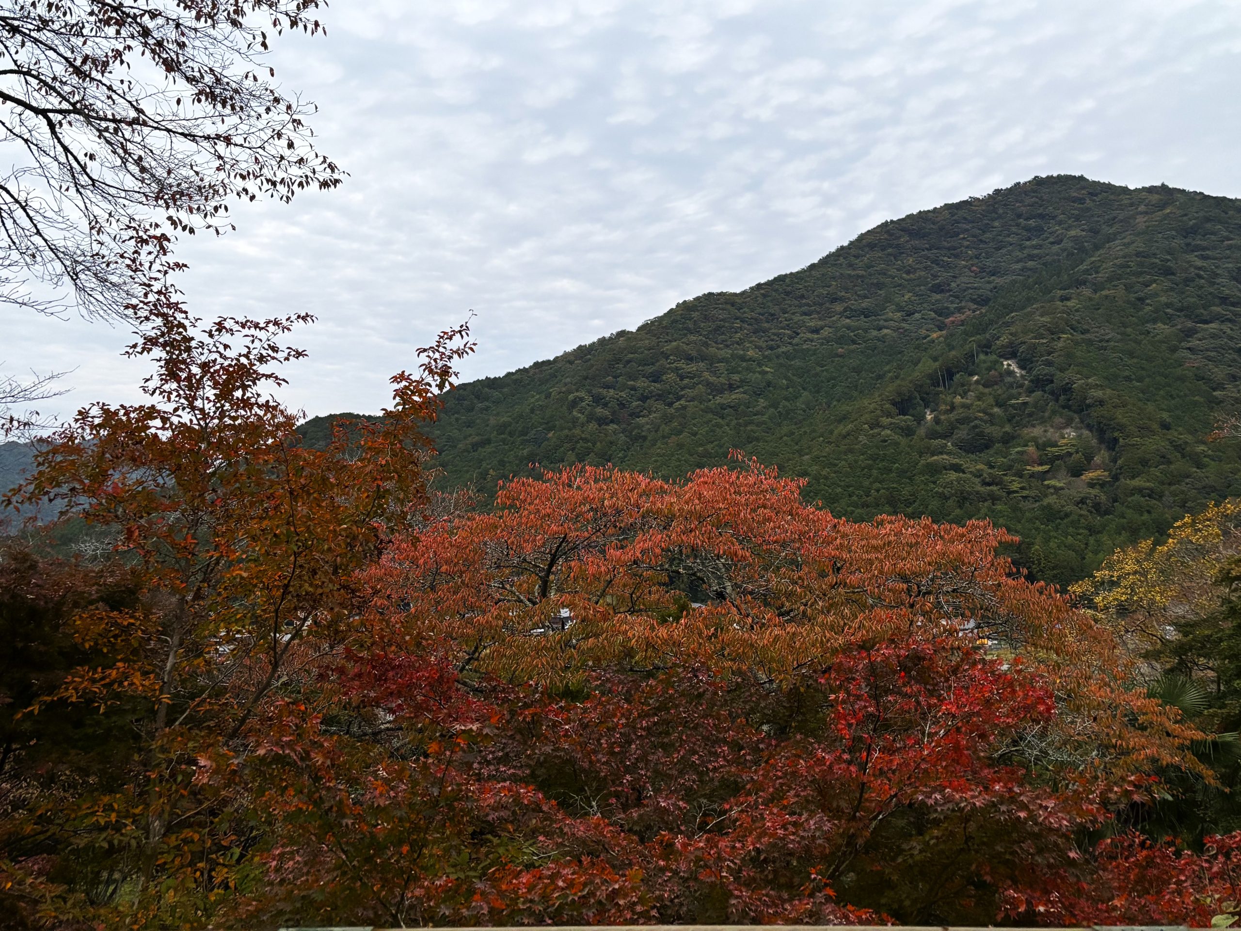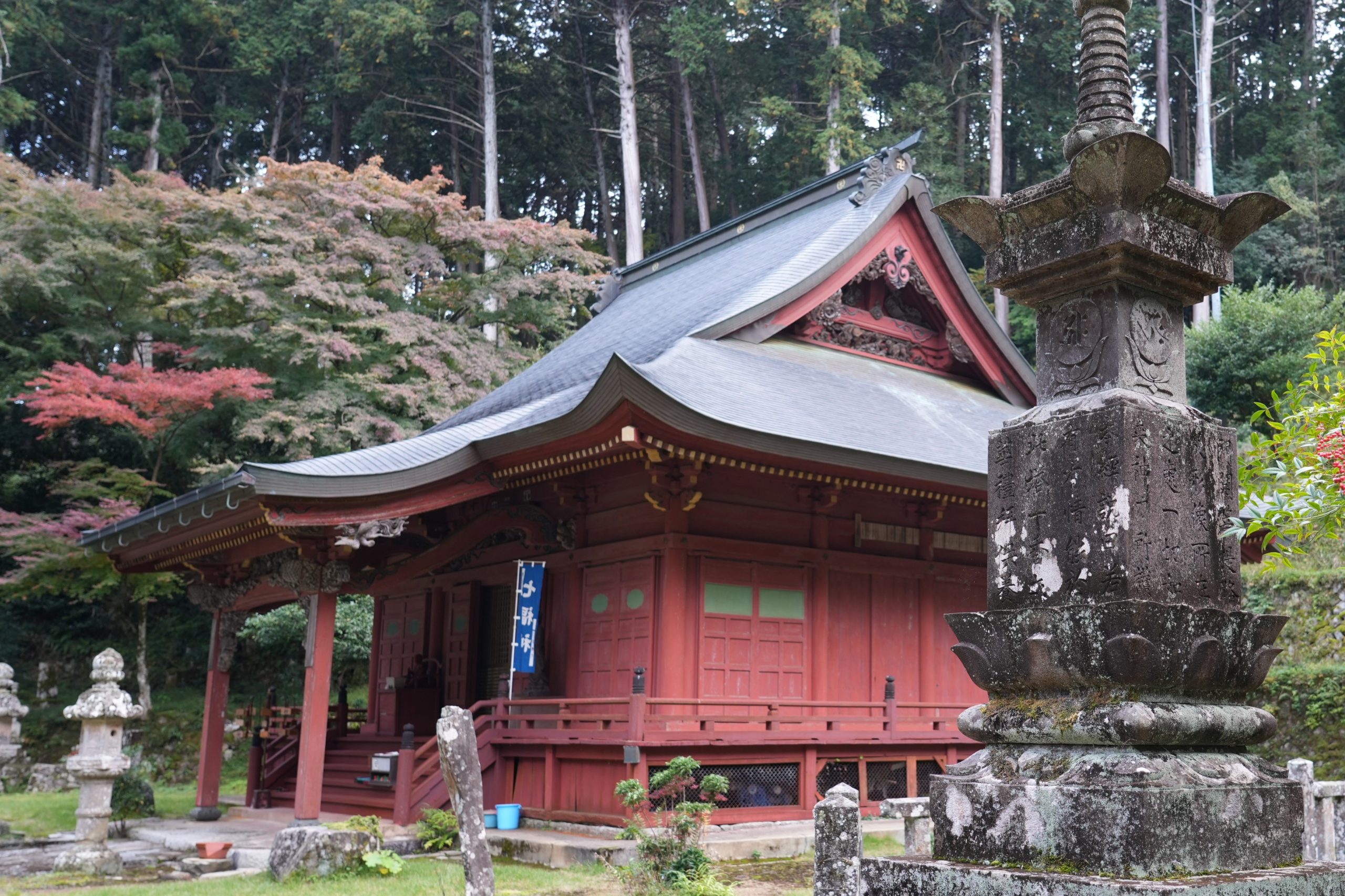 夕暮れ時、白い息を吐きながら歩みを進めると、深い緑の中に建つ紅のお堂が見えてきました。