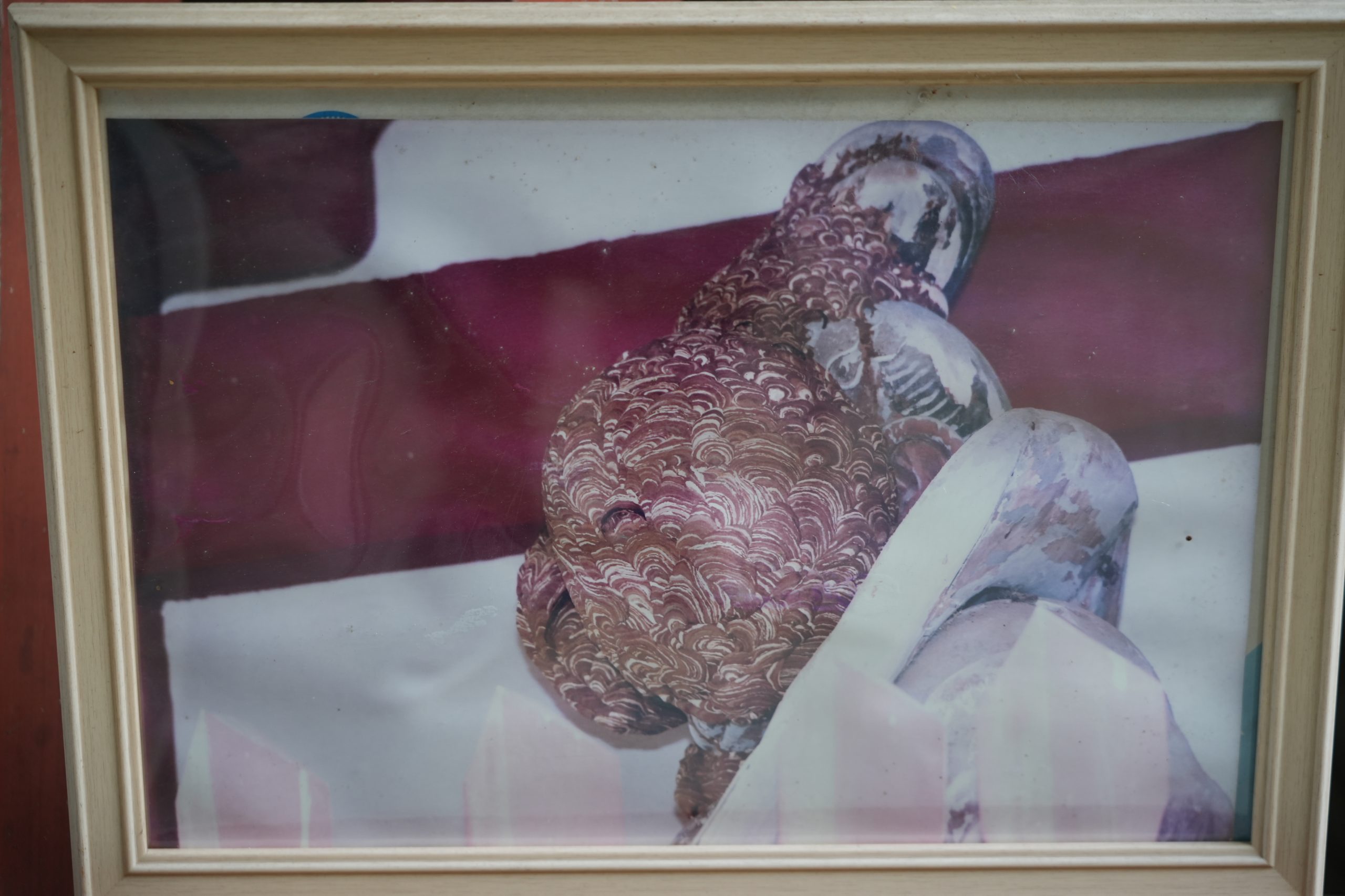 「2020年の8月頃から、吽形像にスズメバチが巣を作ってしまいました。仁王様は造立されてから数百年たつ仏様ですので、当時、目の部分に隙間がありました。おそらく、その隙間から吽形像の胎内に入ってしまったのだと思います。一番巣が大きかった時期には、巣が顔を覆ってしまうほどの大きさになってしまいました。巣を取り除くにしても仏様ですから簡単には取り除くことができず、ハチが巣を離れた時期に巣を取り外し、ご縁のあった仏師の方に修復を実施していただきました。」