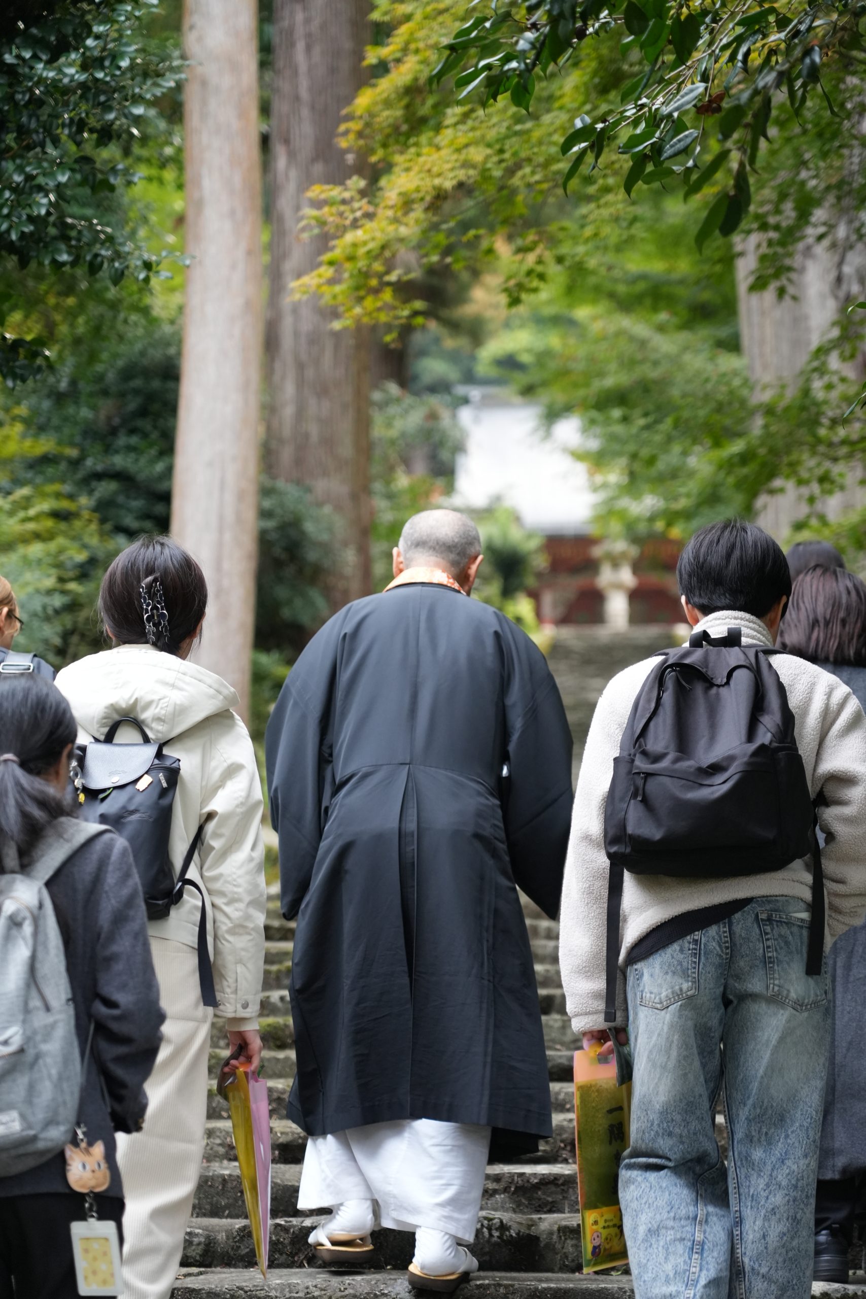 ふと目線を上げると、一直線に本堂へと延びる石段が学生たちを驚かせます。