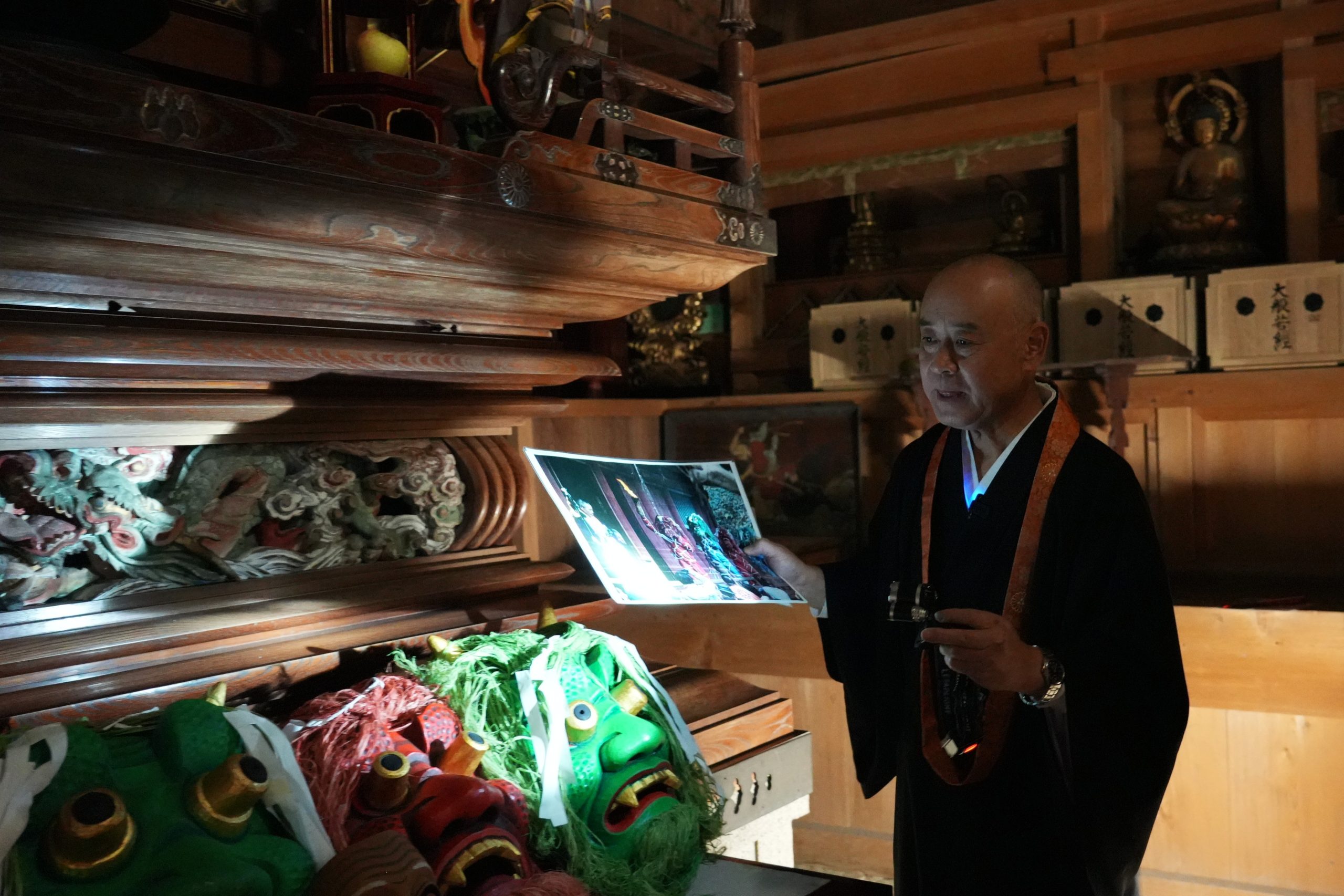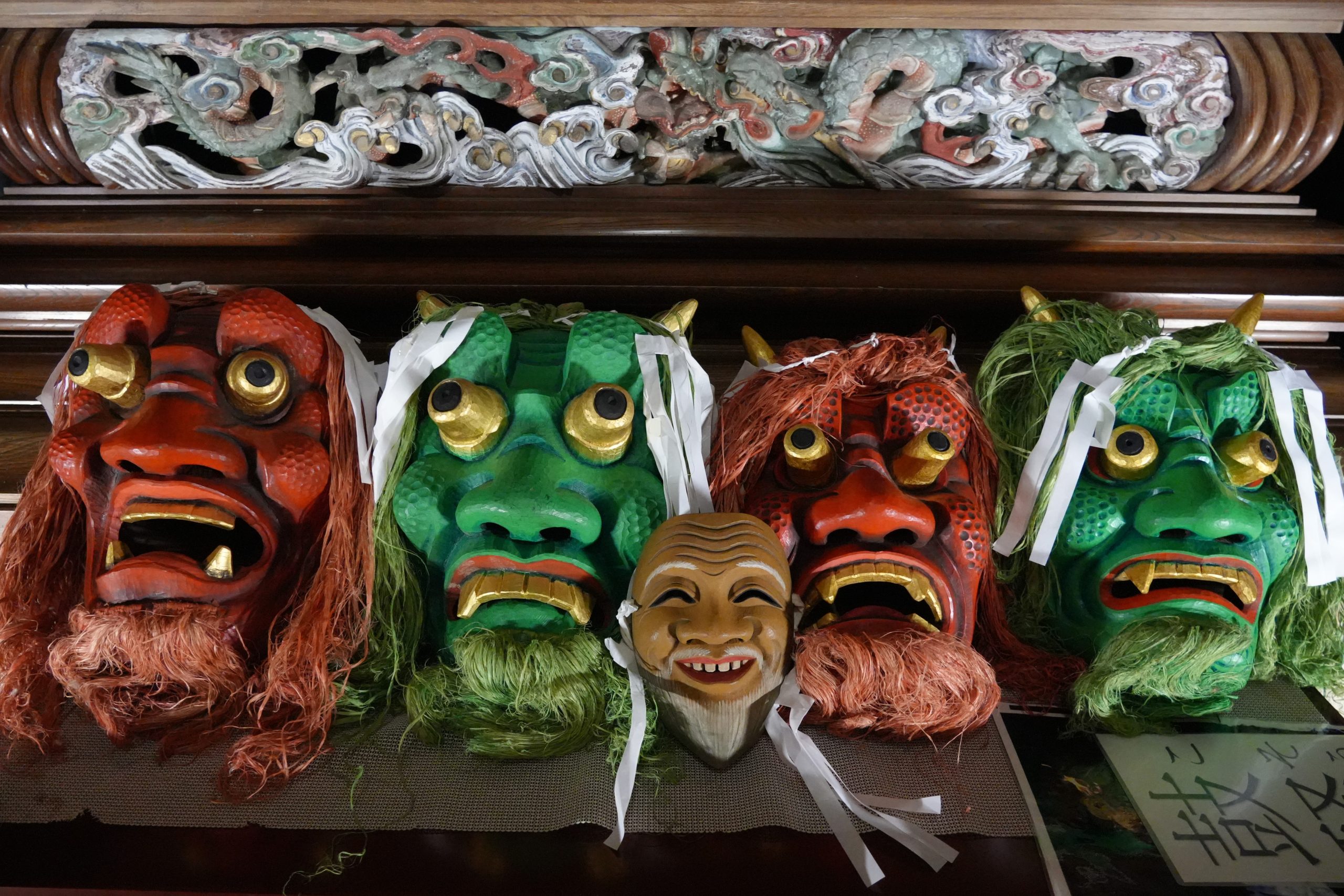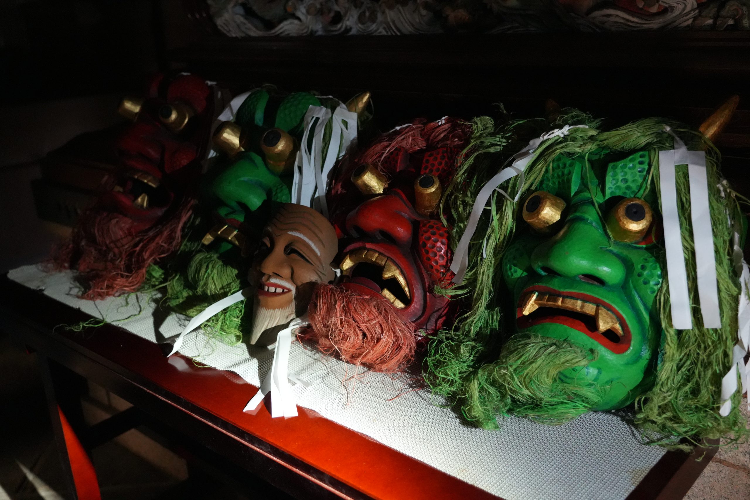 御本尊様がおまつりされる須弥壇の前には、ギョロっとした大きな目が特徴的な大きなお面が並べられていました。