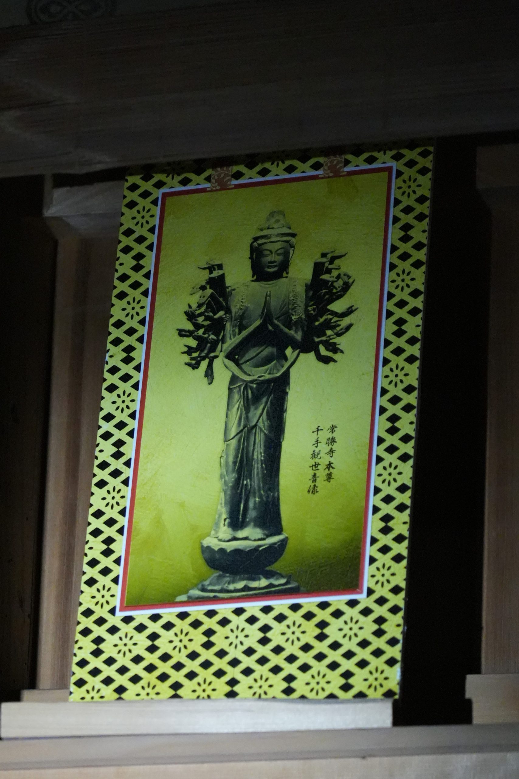 「木造ではなく銅造の珍しい仏様でして、寄木造の仏像と同様に、腕と身体とを別々に鋳造して組み合わせるという技法で造立されています。伝えられているところによると、常勝寺を創建した法道仙人の護念持仏を頸に鋳込んで造立されているそうです。平安時代から鎌倉時代にかけて造立された銅造の千手観音菩薩様は全国的に見ても珍しいそうで、国の重要文化財に指定されています。」