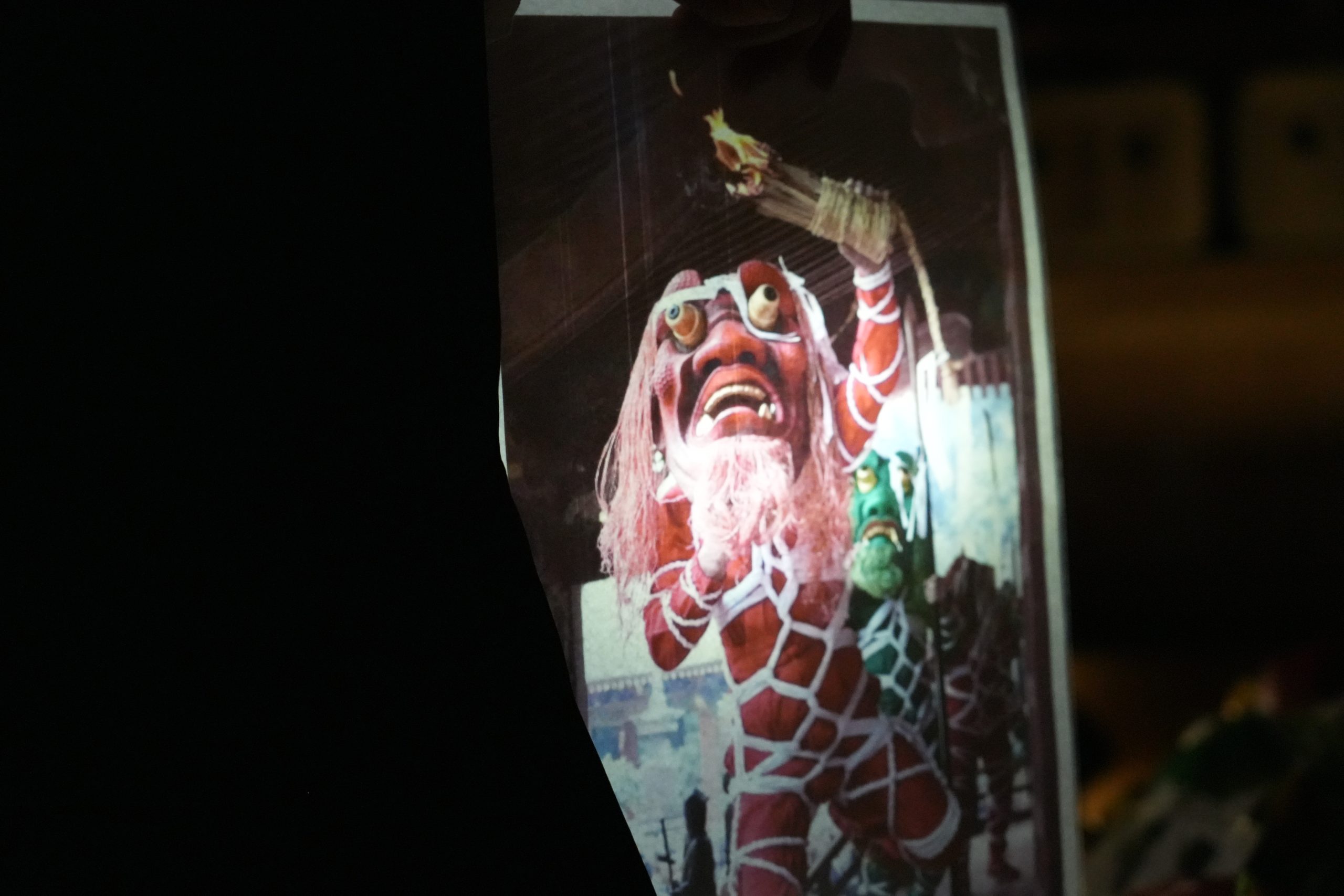 「多くのお寺では、小さな鬼のお面を付け、両手を使い、松明をぶつけるなど荒々しいものが多いのですが、常勝寺の鬼こそは、大きなお面を片手で支えながら、もう一方の手で松明や剣などを持つという珍しいものです。実際に被ると、視野も狭く動くことも大変なのですが、地域の方々から構成されている保存会の皆さんが練習を重ねていただき、毎年素晴らしい鬼こそを行ってくださっています。」